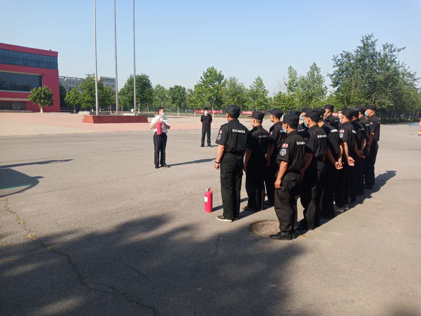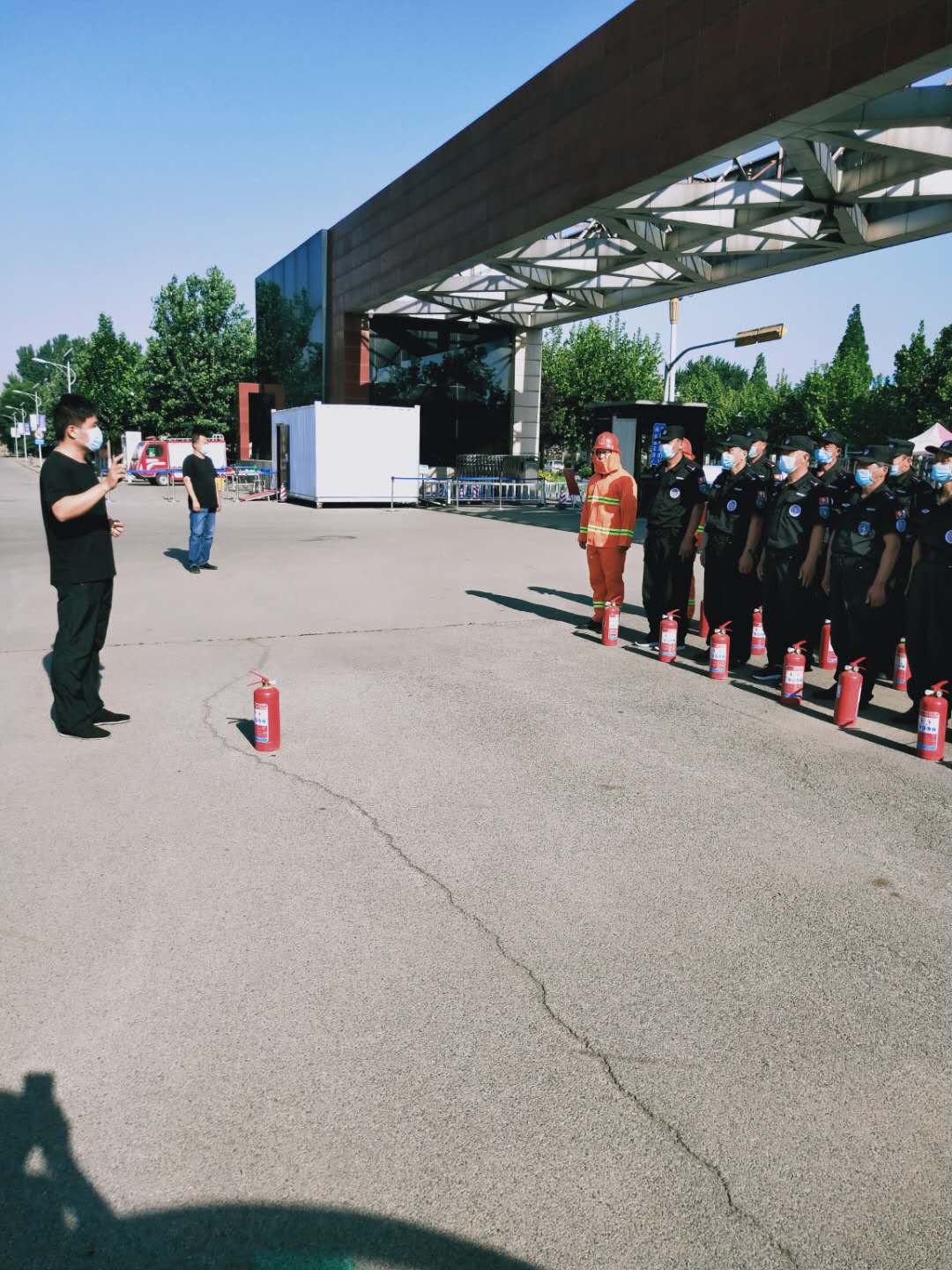 此次演练采取理论和实战相结合,就消防知识、突发火情处置程序对安保人员进行培训。培训了消防器材正确使用方法、防火巡查基本知识、如何扑救初起火灾基本技能及人员疏散、逃生技能;通过现场操作,向保安人员演示灭火器使用、水带铺设、水枪连接等实战训练,同时就水带链接开展出水灭火演练。