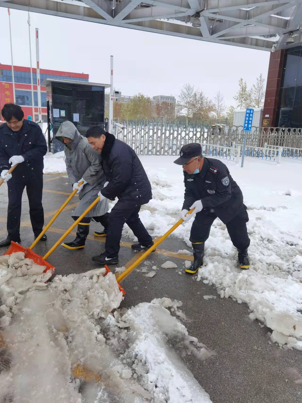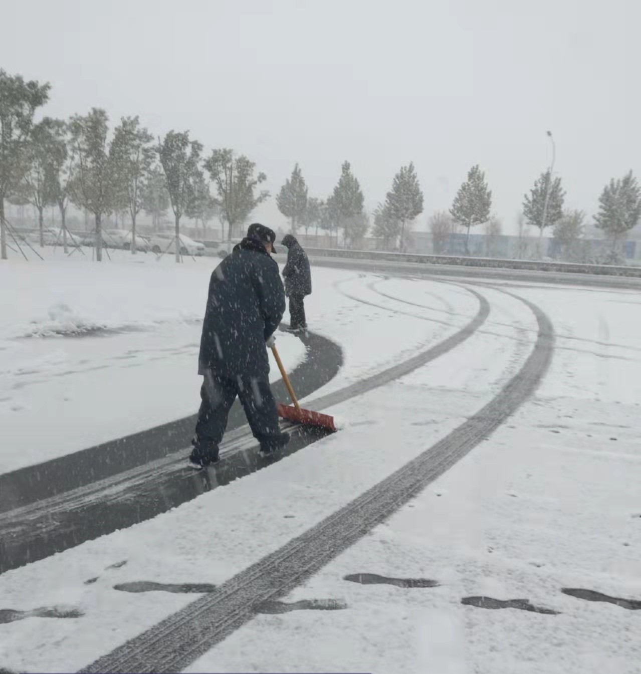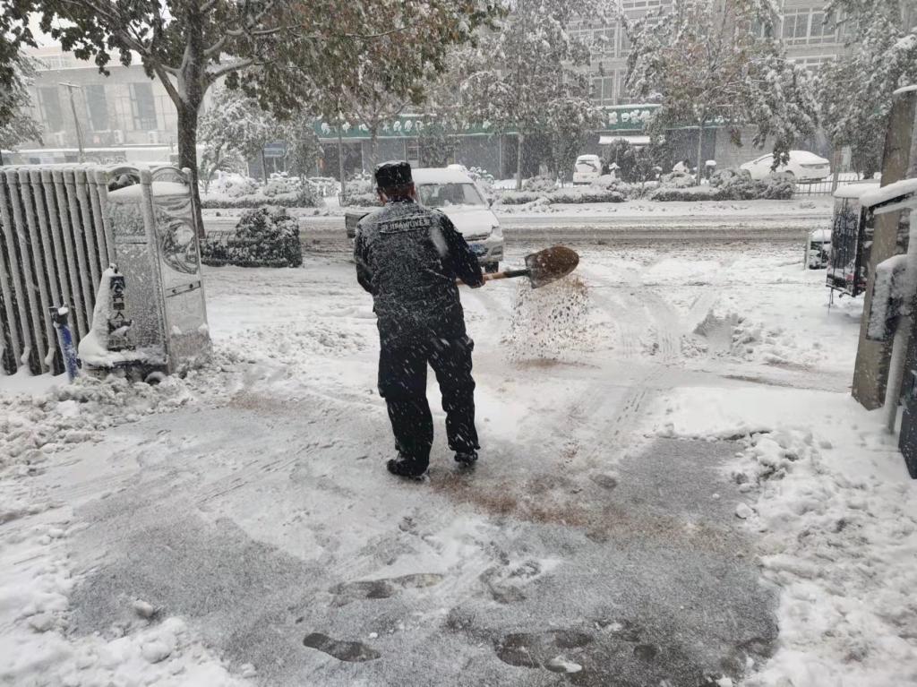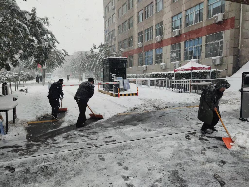 11月7日立冬,初冬的第一场大雪如期而至,整个校园银装素裹,欣然之时,也给校园安全出行带来隐患。保卫处立即启动应急预案,组织安保队员对三校区大门口和主干道的积雪进行全面铲除清扫。