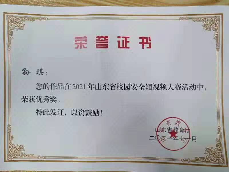 近日,由山东省教育厅举办的校园安全短视频大赛落下帷幕。经过投票统计、专业评审,bat365农业科技学院的孙琪老师拍摄的作品《选择》荣获校园安全短视频大赛优秀奖。