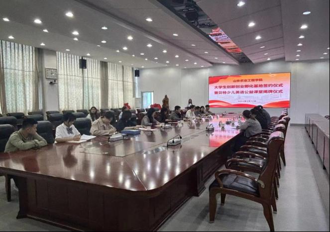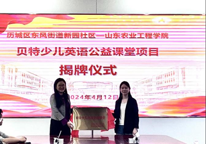 山东农业工学院科技处副处长董婧和王书记为贝特少儿英语公益课堂揭牌。