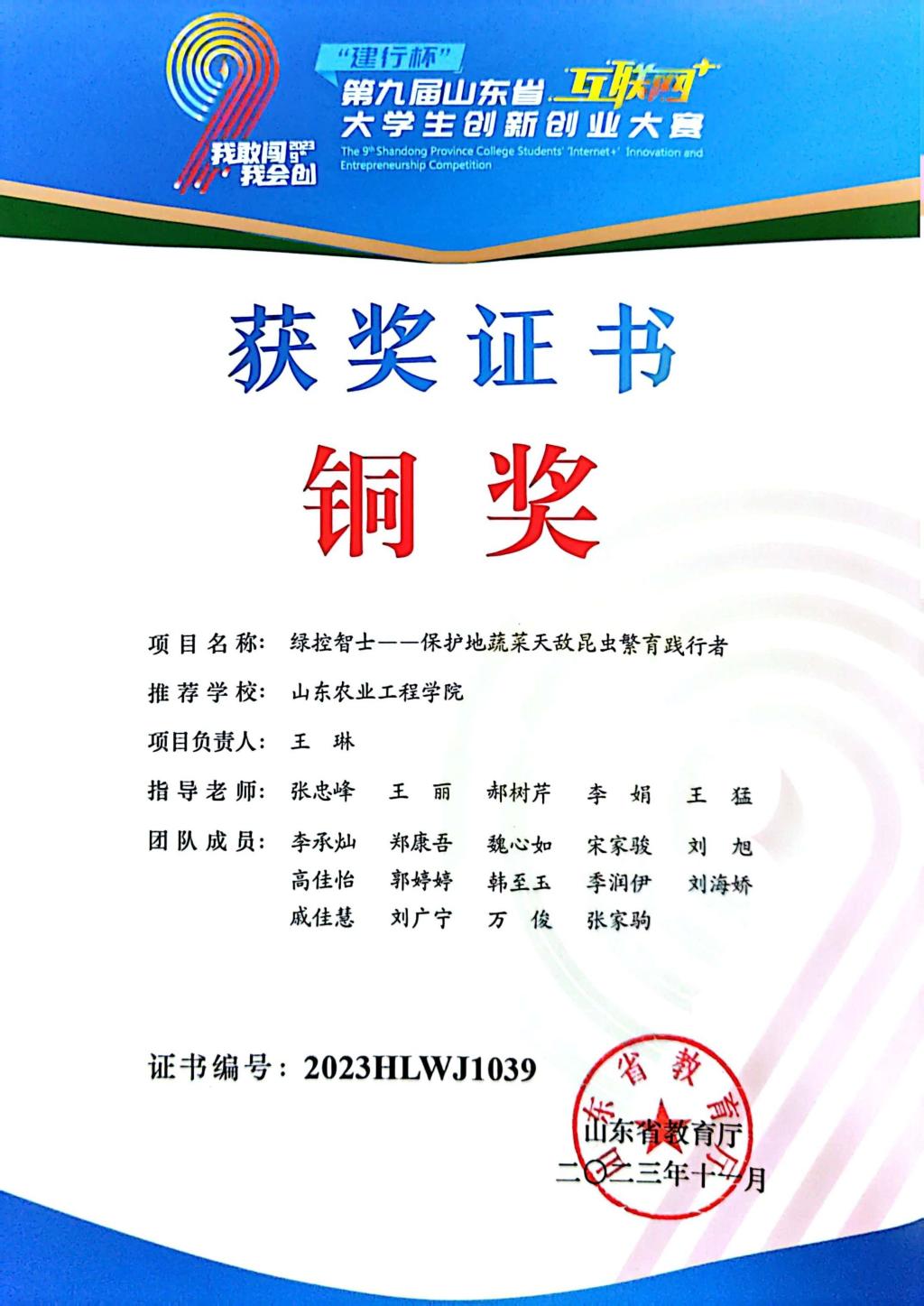 “建行杯”第九届山东省“互联网+”大学生创新创业大赛铜奖项目:绿控智士----保护地蔬菜天敌昆虫繁育践行者