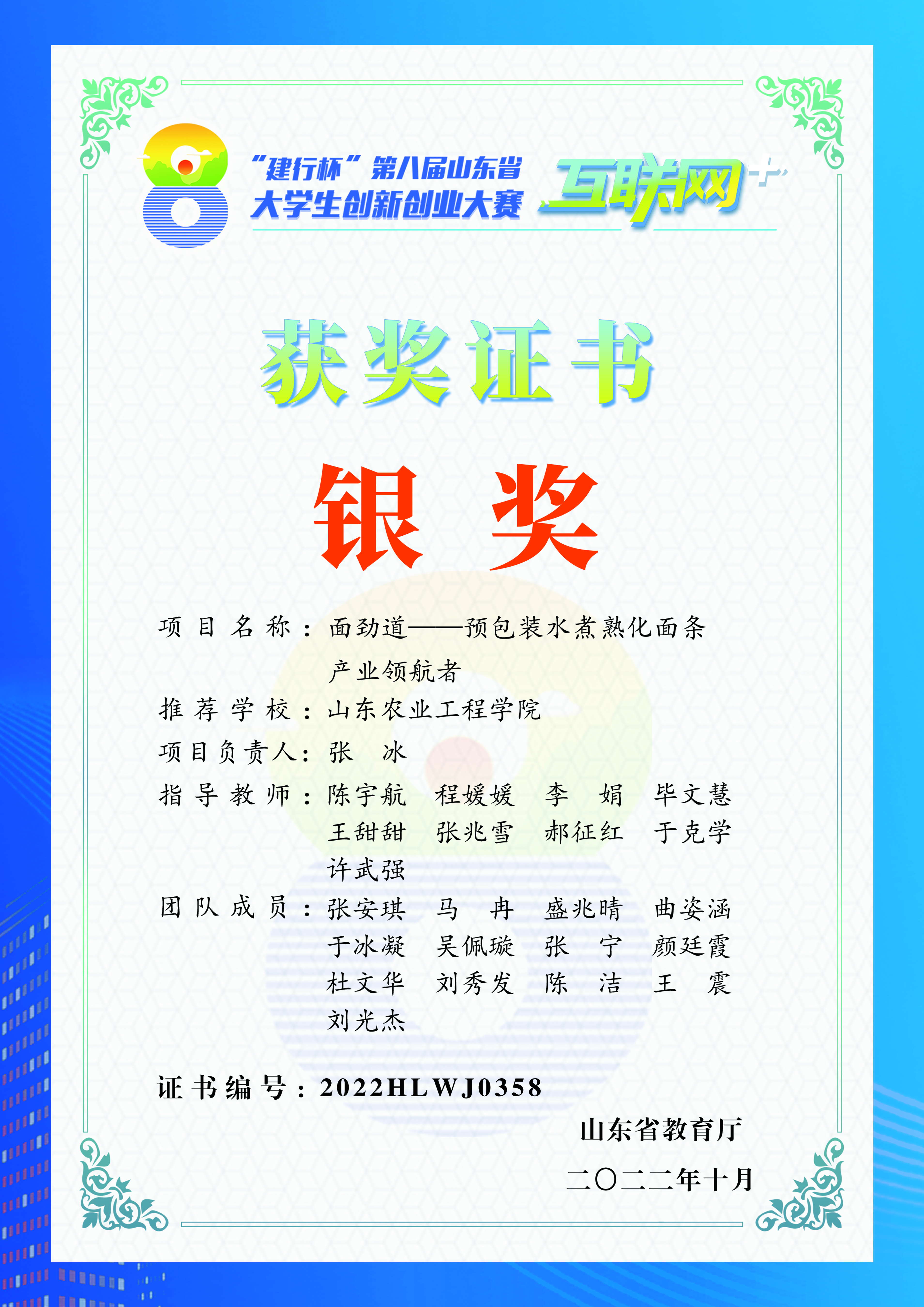 “建行杯”第八届山东省大学生创新创业大赛银奖项目:面劲道——预包装水煮熟化面条