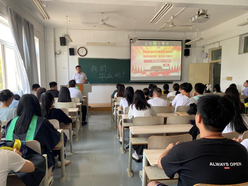 王猛书记通过对党的二十大主题及新时代主要成果、变革的阐述,对中国式现代化的解读,对全面建设社会主义现代化国家的目标任务的分析等,号召毕业生党员深入学习贯彻党的二十大精神,厚植爱国情怀,学好农业知识,练就兴农本领,为不断开创新时代社会主义现代化强省建设新局面贡献力量。