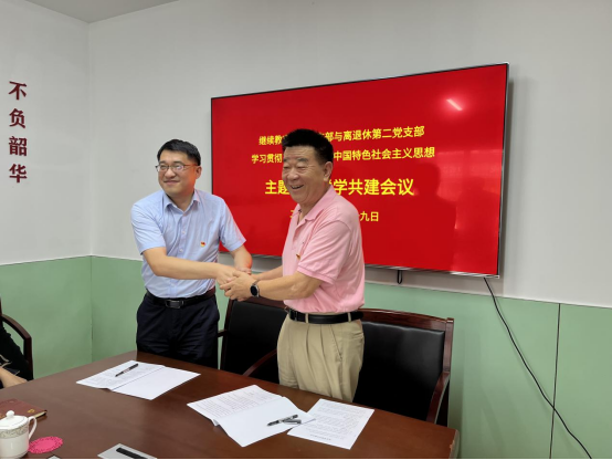 座谈交流会上,两个党支部的党员同志们一起认真学习了5月17日习近平在西安听取陕西省委和省政府工作汇报后发表的重要讲话精神和7月7日学校主题教育工作推进会议精神。离退休干部党委第二党支部书记张胜庆和继续教育学院党支部书记、院长刘庆涛分别就发挥各自党支部的特长优势,开展联学共建的目标任务、活动内容和具体措施展开深入交流,双方商定要持续深入学习贯彻习近平新时代中国特色社会主义思想,贯彻落实党的二十大精神,通过支部结对联学共建,争取在党建活动方面取得新突破,在尊老爱老敬老助老树立文明新风尚中创新发展。随后,张胜庆、刘庆涛代表各自党支部签订支部联学共建协议。