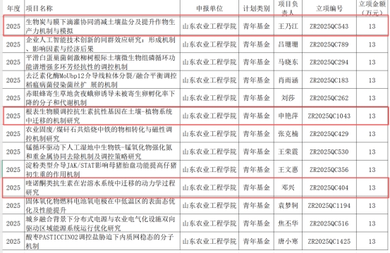 近日,山东省科学技术厅正式公布了2025年度山东省自然科学基金项目评审结果,我院科研团队再获佳绩。其中,王乃江博士主持的《生物炭与膜下滴灌协同消减土壤盐分及提升作物生产力机制与模拟》、申艳萍博士主持的《根表生物膜调控抗生素抗性基因在土壤-植物系统中迁移的机制研究》、邓兴博士主持的《喹诺酮类抗生素在岩溶水系统中迁移的动力学过程研究》三项课题均成功获批立项,获得总资助经费39万元。