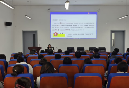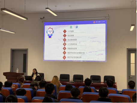 尹虹霞老师为在场的同学们详细解读了周村区当前的就业环境和相关政策,重点介绍了人才金政中的各项补贴政策。她还结合实际案例,深入讲解了创业补贴及贷款支持政策。此外,尹老师详细介绍了高校毕业生社会保险补贴政策以及档案政策,为同学们提供了全面的就业指导。