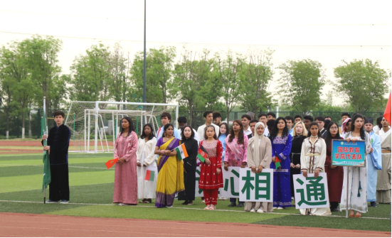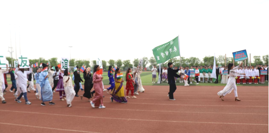 多元方阵展风采,异域风情引瞩目。开幕式上,国际学生方阵惊艳亮相,成为全场焦点。他们身着绚丽多彩的民族服饰,手持各国国旗,步伐整齐划一,用标准的中文喊出响亮口号“留学山农工,友谊心相通”。随着动感音乐响起,同学们瞬间化身舞者,跳起热情奔放的民族舞蹈。灿烂的笑容、灵动的舞步,将异域文化的独特魅力展现得淋漓尽致,赢得现场师生的阵阵喝彩,传递着青春的热情与朝气。
