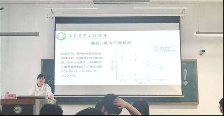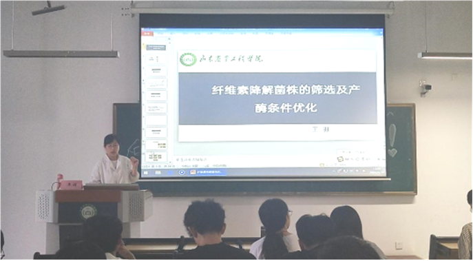 报告会中,王羽老师首先向同学们介绍了纤维素降解菌的研究意义,让同学们对纤维素降解菌有了初步了解,认识到了纤维素降解菌对我国农业发展的重要意义。接着王羽老师介绍了筛选纤维素降解菌的实验内容及方法,对纤维素降解菌分别进行酶活测定,比较降解能力;通过各组数据和图例阐述了自己最终得出纤维素降解菌株筛选的成果。