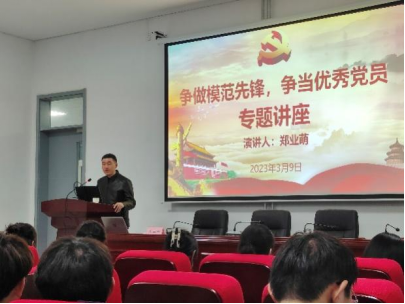 最后郑业萌书记作“争做模范先锋 争当优秀党员”专题讲座,从考研、就业、学术研究等方面向大家讲述了学院在立德树人工作中的成效与优势,号召广大学生深入学习贯彻党的二十大精神,能够志存高远、勤学上进、意志坚韧,为推进中国式现代化,实现中华民族伟大复兴贡献聪明才智。
