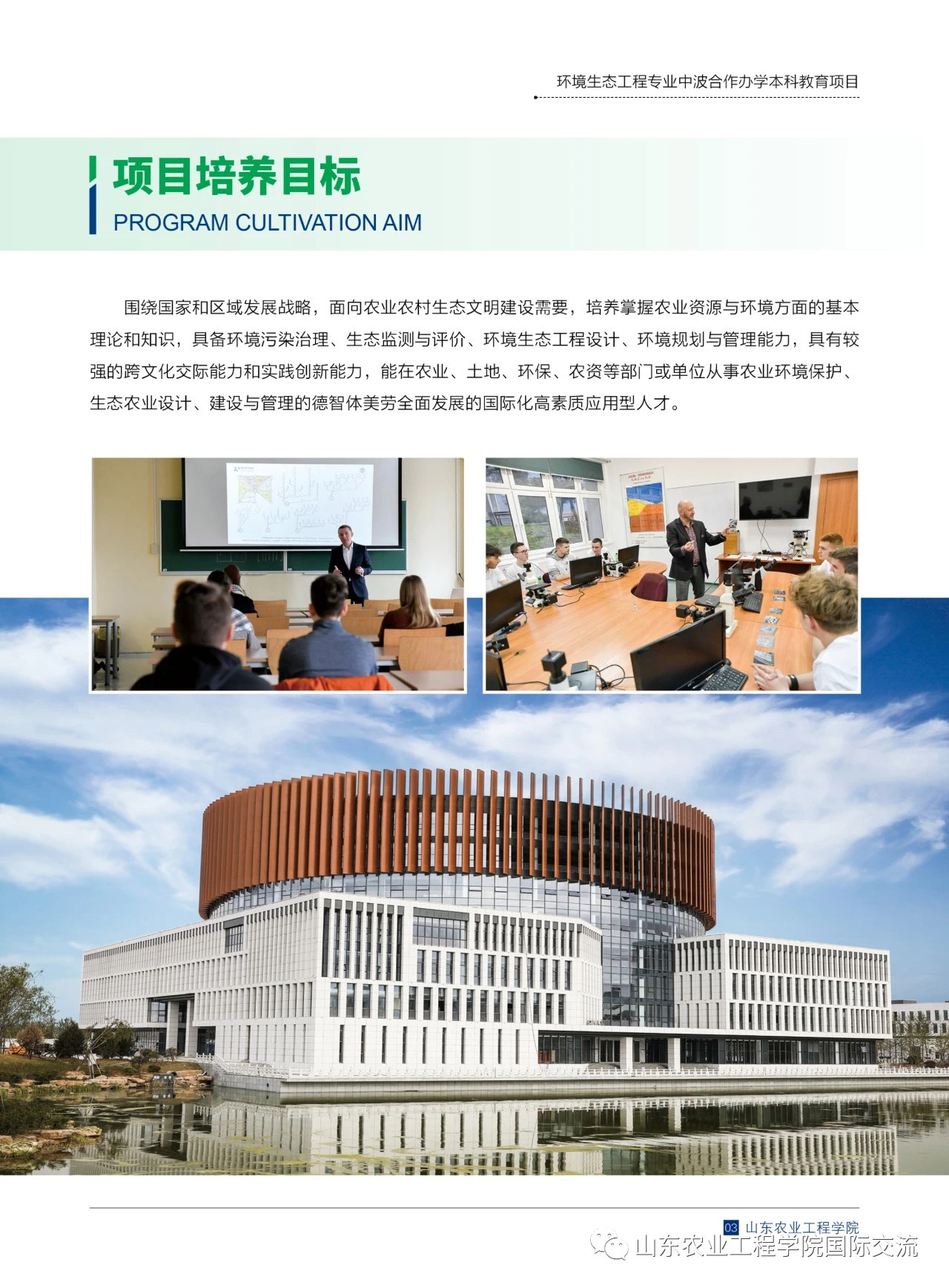培养目标:本专业培养掌握生态环境方面的基本理论和知识,具备环境污染治理、生态监测与评价、环境生态工程设计、环境规划与管理能力,具有较强的跨文化交际能力和实践创新能力,能在农业、土地、环保、农资等部门或单位从事农业环境保护、环境工程设计、建设与管理的德智体美劳全面发展的国际化高素质应用型人才。