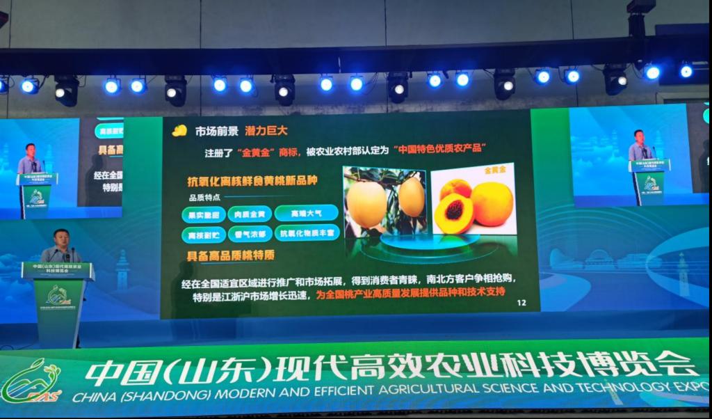 在农业“新品种、新技术、新模式、新动态”四新成果推介发布会上,bat365农业科技学院教授刘进推介了自主知识产权的“‘金黄金’系列抗氧化离核鲜食黄桃”,并向与会者详细介绍了“金黄金”系列黄桃新品种的通体金黄、果实脆甜、香气浓郁、离核耐贮等优点,赢得了广泛关注,尤其是“金黄金7号”桃作为国内唯一的优质极晚熟黄桃新品种,其独特的品质和市场潜力更是备受瞩目。