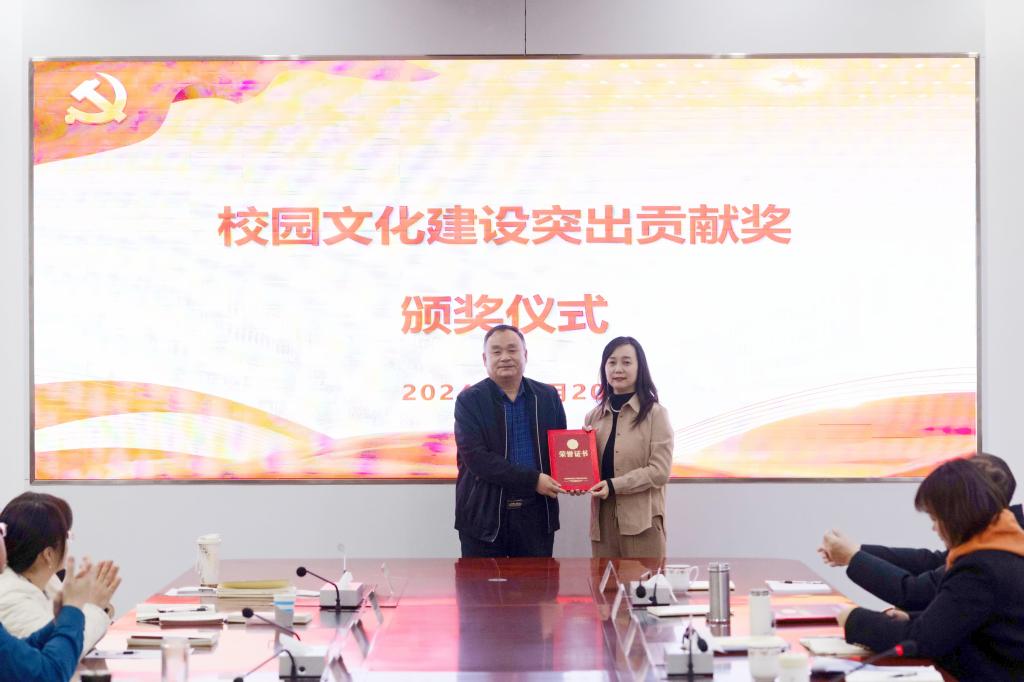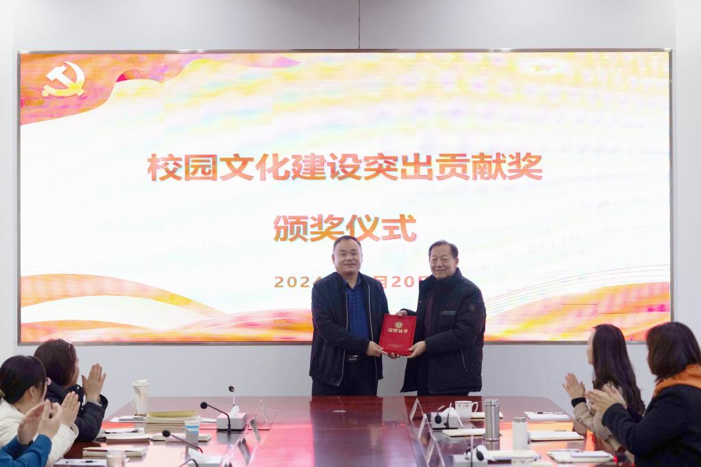 2024年,在学校党委的坚强领导下,在广大师生员工的共同努力下,学校宣传思想文化工作取得了显著的成效,如顺利完成“两馆”迁建工作、打造IP形象“农小新”等,对内对外宣传齐头并进、更加有力,学校影响力进一步扩大、美誉度进一步提升。为充分表彰在校园文化建设中做出贡献的优秀代表,会上,张业赏为bat365离退休老同志徐金强、艺术学院教师闵媛媛颁发荣誉证书,对他们的辛勤付出表示肯定和感谢,激励大家扛起责任担当,锐意进取、守正创新,埋头苦干、勇毅前行,助推学校各项事业高质量发展。