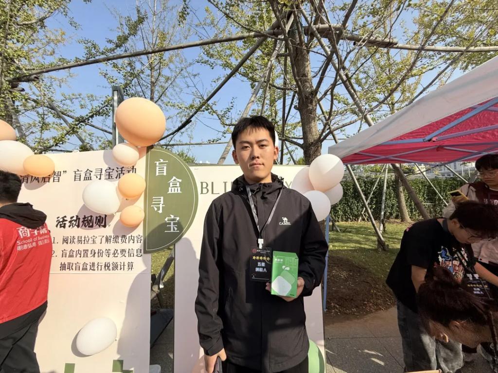 本次活动在学院的全面统筹下策划实施,旨在通过结合学院专业特点,以居民个人所得税为主题展开。为了提高学生们的兴趣和参与度,特别设计了广受欢迎的盲盒寻宝环节。参与者有机会从盲盒中随机抽取不同的职业角色卡片,每张卡片附带该角色的相关纳税信息。依据活动现场设置的税务知识展示板提供的信息,学生们能够计算出对应职业角色所需缴纳的个人所得税额,正确完成任务的同学将被授予“五星纳税人”的荣誉头衔。活动不仅让学生们掌握了实用的生活技能,还加深了他们对于依法纳税重要性的理解,在心中播下了公正廉洁的种子。