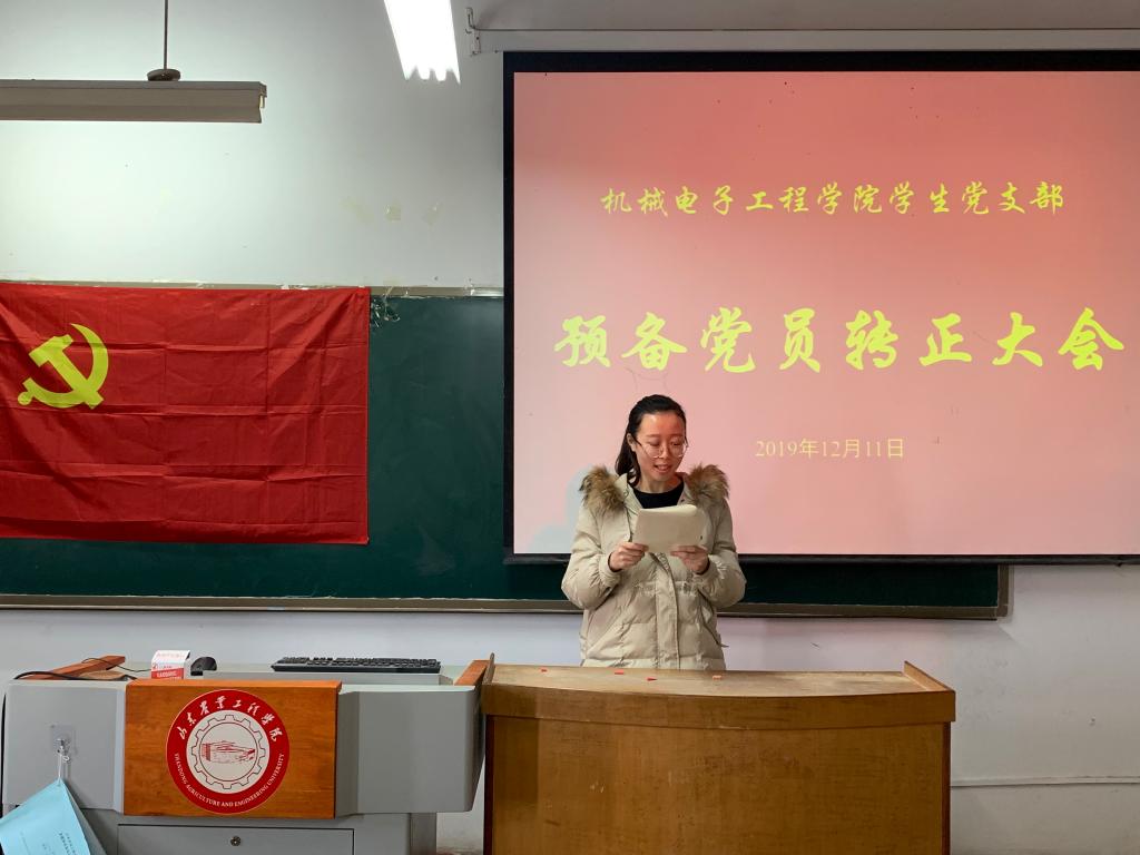 2019年12月11日,机械电子工程学院学生党支部于北校区2号教学楼215教室召开了2019年下半年预备党员转正大会。大会由学生党支部书记郑业萌主持,学生党支部全体党员及16名拟转正预备党员参加了大会。