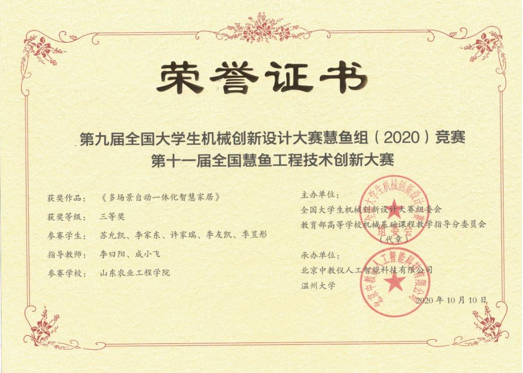 近日,由全国大学生机械创新大赛委员组、教育部高等学校机械基础课程教学指导委员会主办,温州大学承办的第九届全国大学生机械创新设计大赛慧鱼组竞赛在温州大学落下帷幕。我院选送的两件作品全部获得国家级三等奖,实现了我院在这项赛事奖项上从无到有的突破。