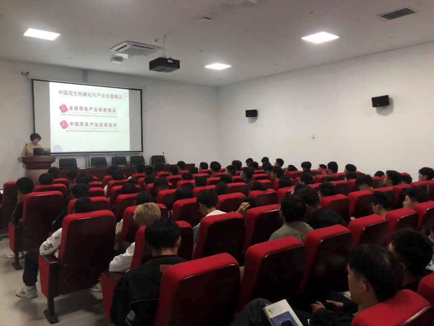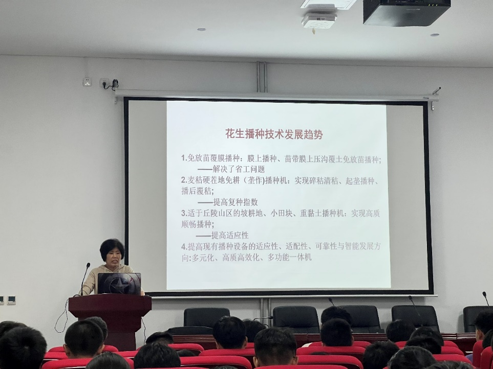 孙居彦教授首先对中国花生机械化总体情况进行系统地概述,对花生机械化发展现状展开详细介绍。其次,孙居彦教授列举了当前主要播种机的类型,重点讲解了花生收获机、农业植保机器人,并对国内外花生产量进行对比分析,使同学们体会到当前中国花生机械化的发展速度以及先进技术的重要性。最后,孙居彦教授对花生播种技术发展趋势进行了展望,预测了未来花生的产量质量问题的完善趋势,指出了未来播种设备的发展重点方向,展示了新一代花生挖掘条铺机的功能特点。