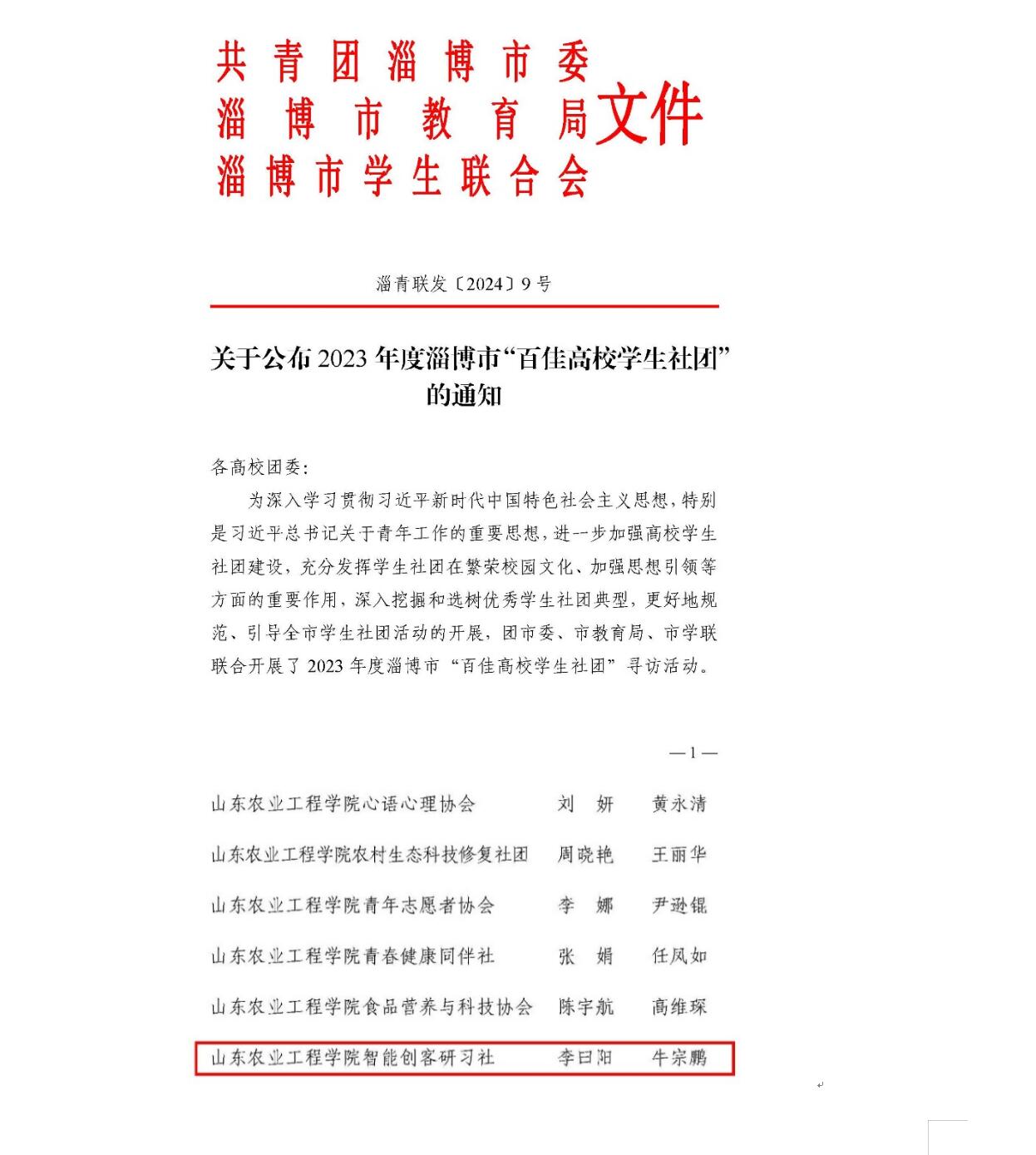 近日,由共青团淄博市委、市教育局、市学生联合会联合开展了2023年度淄博市“百佳高校学生社团”寻访评选活动。经过激烈的角逐,我院智能创客研习社凭借其出色的竞赛成绩、社团组织建设能力等荣获“2023年度淄博市百佳高校学生社团”,李曰阳荣获“百佳高校学生社团指导教师”,牛宗鹏荣获“百佳高校学生社团骨干”。