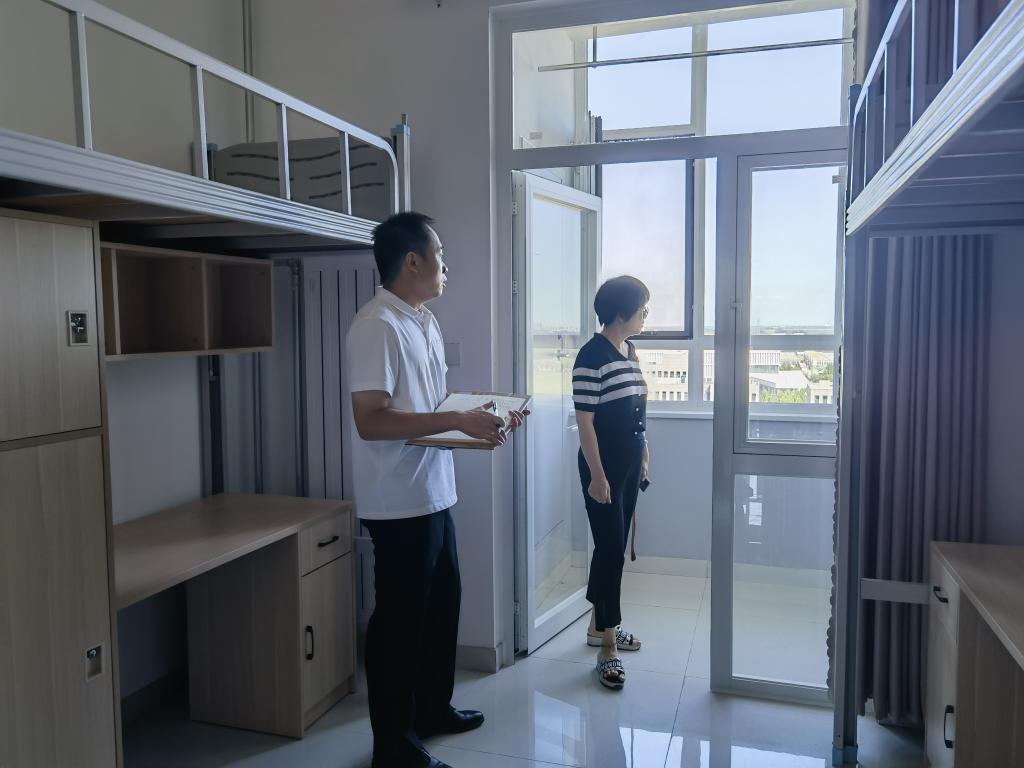 李艳书记带队检查了新生各项生活基础设施和防火门的使用情况,针对学生宿舍内的安全逃生出口提出了整改建议。赵侃书记着重查看了宿舍内的各项硬件设施,对宿舍内的电器开关、空调等房间配套设施逐项检查并及时记录,并对检查中发现的各项问题提出了整改意见,力求为新生入住提供安全舒适的环境。