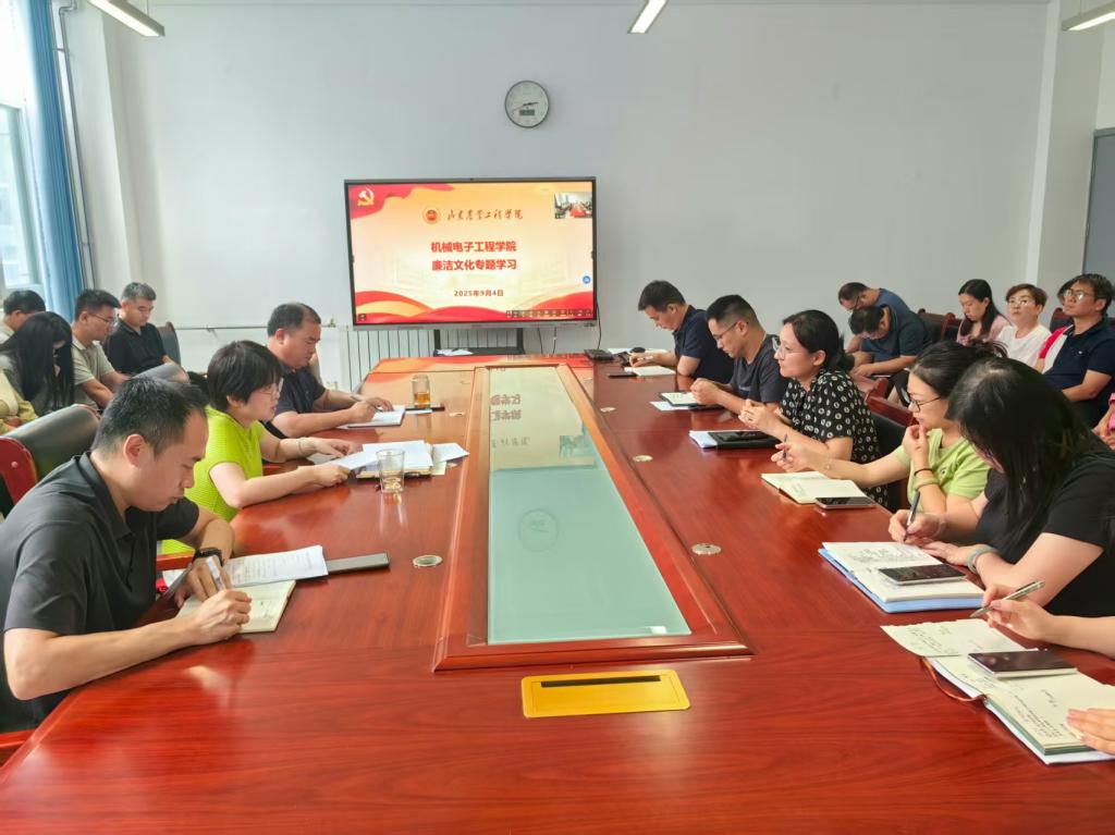 新学期伊始,为深入贯彻中央八项规定精神学习教育成果、推动全面从严治党向纵深发展,机械电子工程学院于9月4日召开廉洁文化专题会议,全体党员同志及教职工参会。会议由机械电子工程学院党总书记李艳围绕“筑牢廉洁防线、推动高质量发展”作讲话,明确新学期廉洁建设方向与要求。
