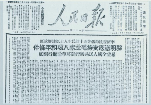 ▲1949年1月22日,李济深、沈钧儒等55人联名发表对时局的声明,拥护毛泽东提出的八项和平条件。这是《人民日报》的有关报道。