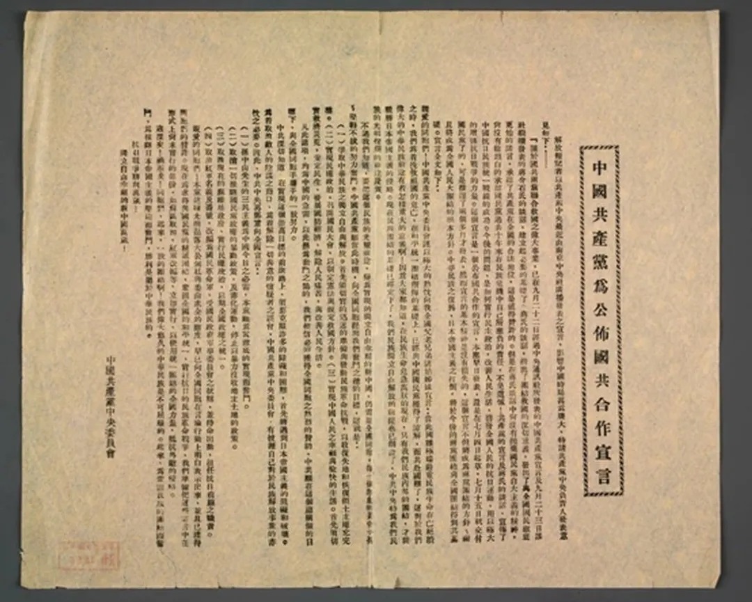 9月22日,国民党中央通讯社发表《中共中央为公布国共合作宣言》,第二天,蒋介石发表实际上承认共产党合法地位的谈话。国共两党重新合作,中国抗日民族统一战线正式形成。