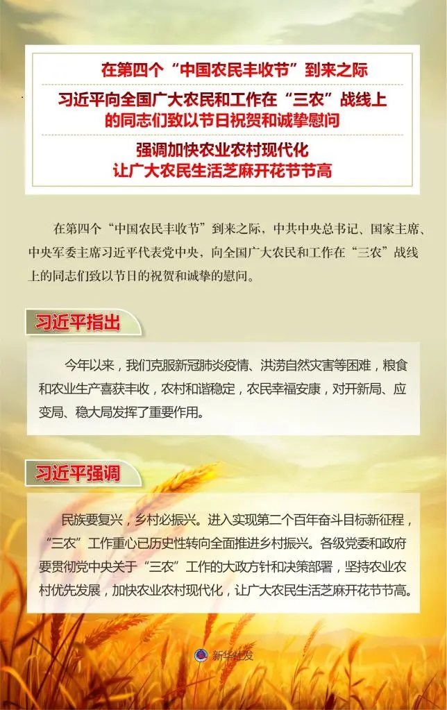习近平总书记强调:“希望广大农民和社会各界积极参与中国农民丰收节活动,营造全社会关注农业、关心农村、关爱农民的浓厚氛围,调动亿万农民重农务农的积极性、主动性、创造性,全面实施乡村振兴战略、打赢脱贫攻坚战、加快推进农业农村现代化,在促进乡村全面振兴、实现‘两个一百年’奋斗目标新征程中谱写我国农业农村改革发展新的华彩乐章!”