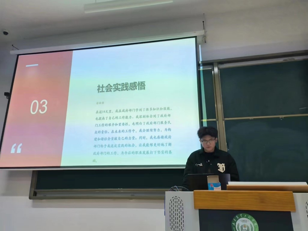 在本次分享会上,同学们依次向大家介绍“返家乡”社会实践经历与心得感悟。他们有的深入社区开展健康宣讲活动,有的走进人民政府为服务人民贡献出自己的一份力量,还有的投身于家乡企业,以实际行动助力社会进步。每一位同学都用自己的行动诠释自身的价值。