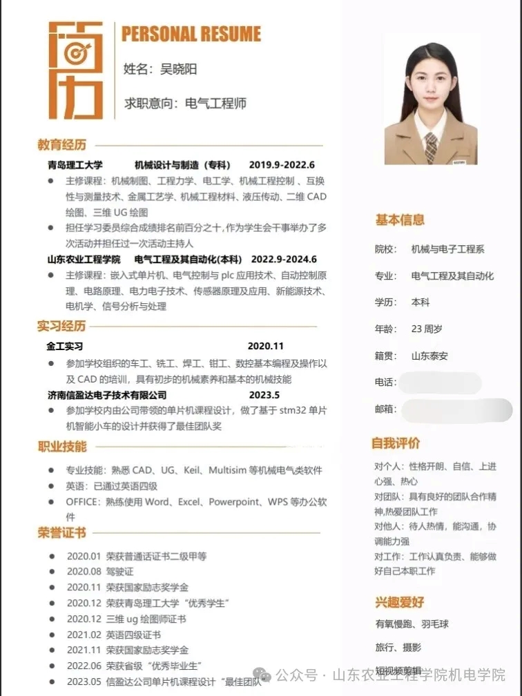 简历是求职的敲门砖,也是同学们展示自身素质和能力的重要窗口。为引导同学们树立正确的就业观念,明确自身职业目标,增强就业意识,提升求职技能,促进更高质量充分就业。机械电子工程学院于3月6日至3月13日举办“简自我风采,历职场未来”毕业生简历设计大赛。此次比赛由我院学生会宣传部承办。