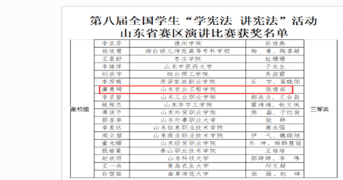 近期,山东省教育厅公布了第八届“学宪法 讲宪法”活动的获奖名单,我院2021级机械电子工程2班廉勇琦荣获山东省赛区演讲比赛三等奖,张倩茹老师获优秀指导教师。