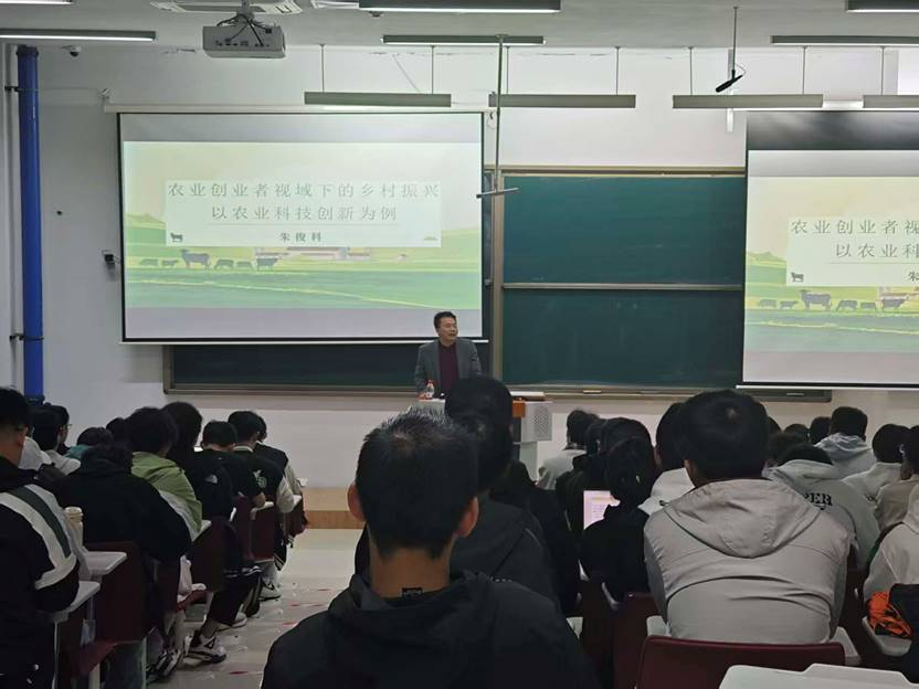 朱俊科首先从其个人创业与实践经历切入,生动阐述了一名农业从业者如何将个人理想融入国家农业农村发展大局。其次深入剖析了制约我国农业高质量发展的关键问题—种业“卡脖子”难题,结合具体案例,详细讲解了农业科技创新如何在突破种源瓶颈、保障粮食安全方面发挥决定性作用。最后介绍了当前国家层面出台的一系列支持农业科技研发与应用的政策导向。朱俊科既有宏观的政策解读,又有微观的实践案例,使在场师生对乡村振兴战略的复杂性和系统性有了更全面的认识,对科技兴农的现实路径有了更深刻的理解。
