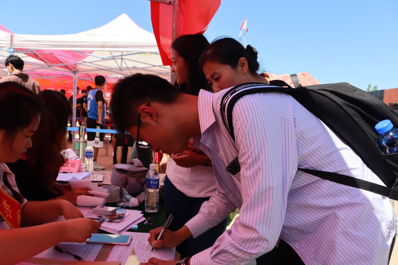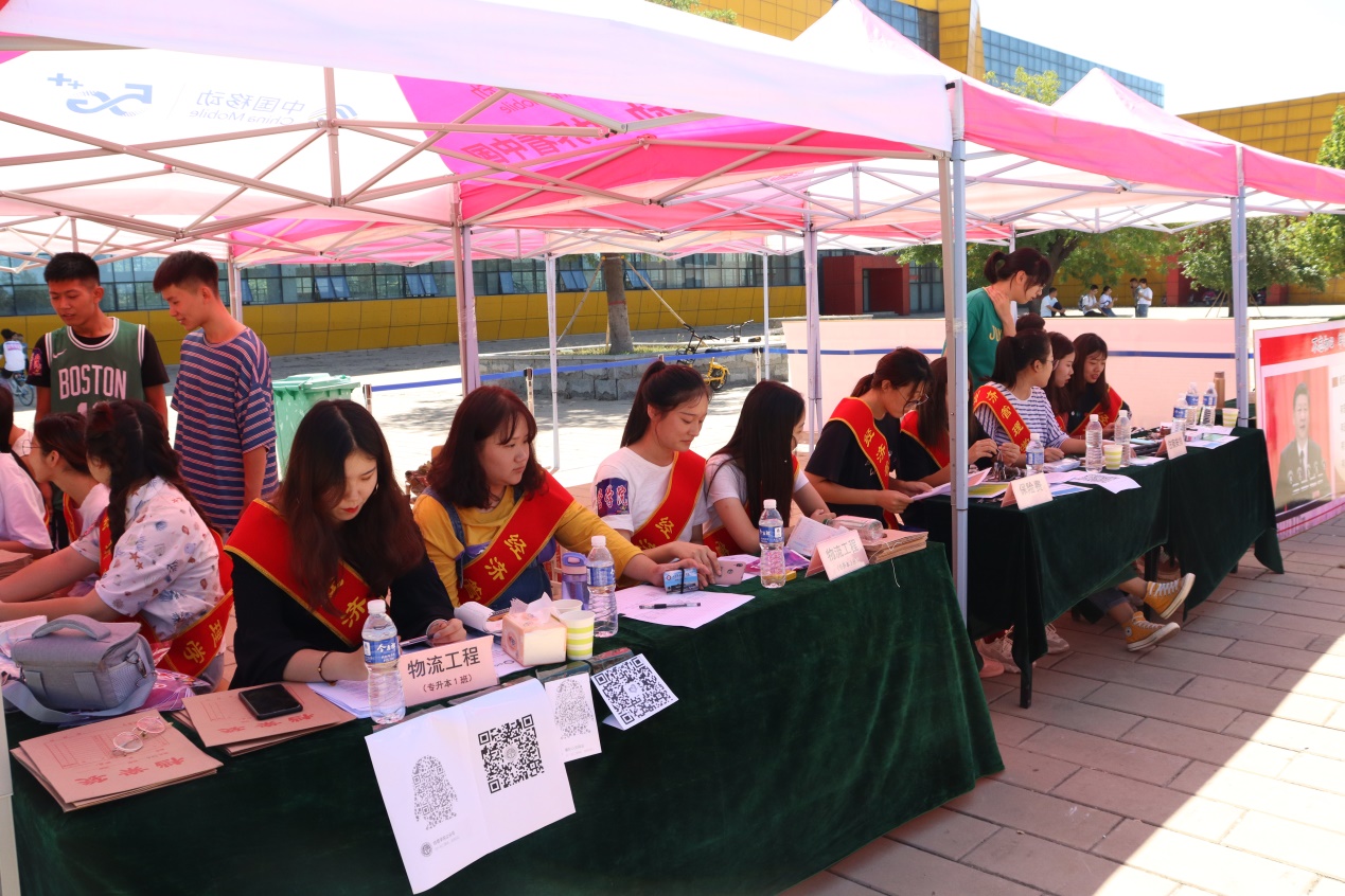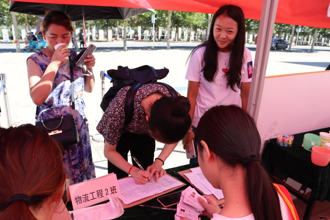 迎新现场,学生会学生志愿者协同辅导员,帮助新生完成学籍注册、购买生活用品、入住宿舍等工作。为了让新生尽快熟悉新环境、更快融入学校生活、志愿者们向新生们介绍了学校的建筑分布以及讲解有关宿舍注意事项。良好的工作素质和态度获得新生和家长的连连夸赞。