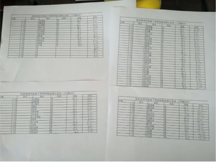今年的毕业论文答辩与往年不同的是,同学们进入教学楼要先测量体温,体测高于37.3度的同学将不能进入教学楼,到达教室后需要再次测量体温,并做好体温登记才能进入答辩教室。