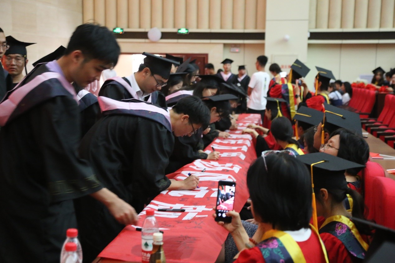 毕业生们在“2021届毕业生鹏程万里、扬帆远航”横幅上庄重的签下自己的名字。