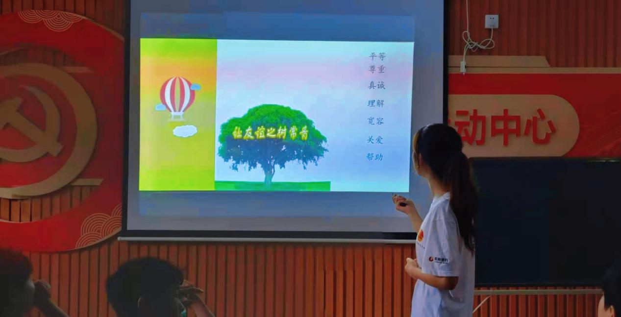 志愿者准备了四场情境剧邀请孩子们进行表演,身临其境的去感受“朋友”的含义。在四场不同的情境中,大家根据遇到的问题发表自己的观点,说出自己的解决方法,在对“朋友”有了更全面认知的同时,也知道了如何更好地解决朋友间的矛盾。在志愿者的引导下,同学们自己总结出来了使友谊之树长青的几种方法:平等、尊重、真诚、理解、宽容、关爱、帮助。