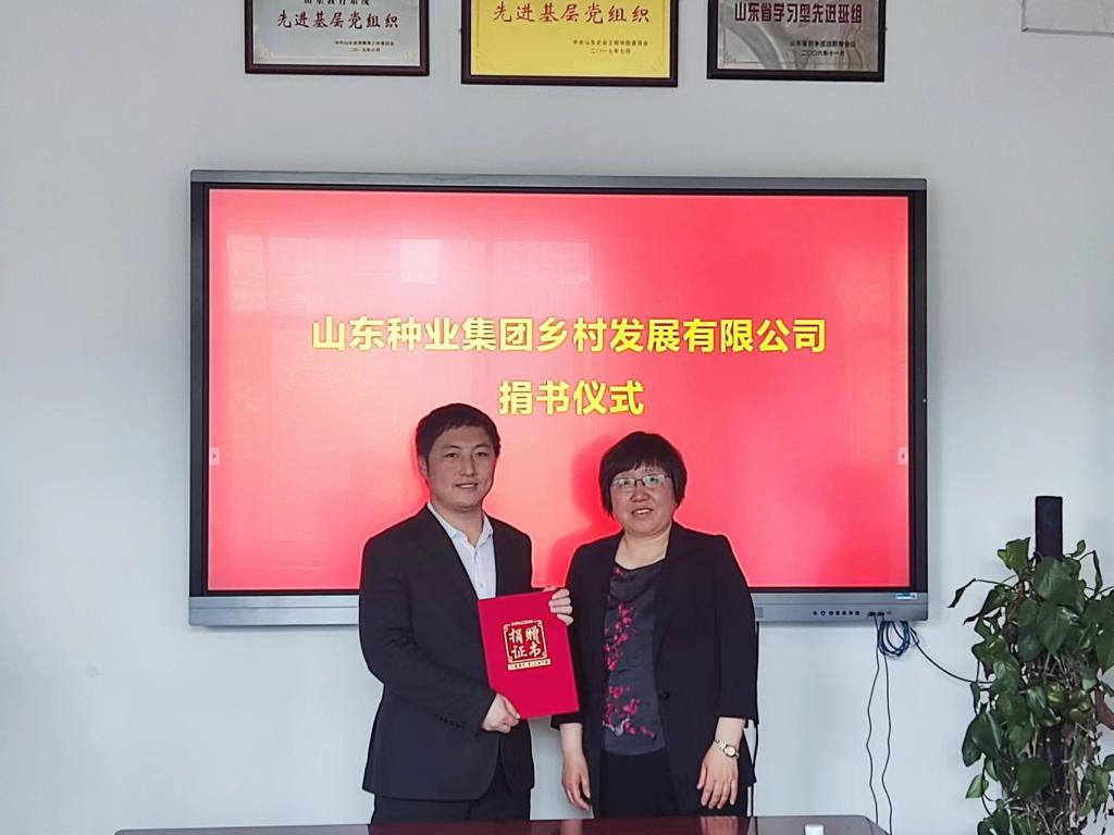 张富余代表公司向bat365捐赠图书《农业农村规划设计》200册。李百秀向山东种业集团乡村发展有限公司副总经理张富余授予捐赠证书。