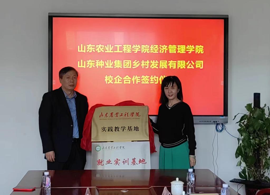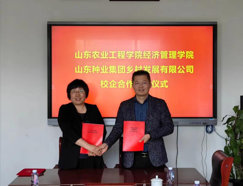 经济管理学院院长李百秀与山东种业集团乡村发展有限公司总经理李襄良签订校企产学研合作协议、社会实践合作协议与就业实训合作协议。