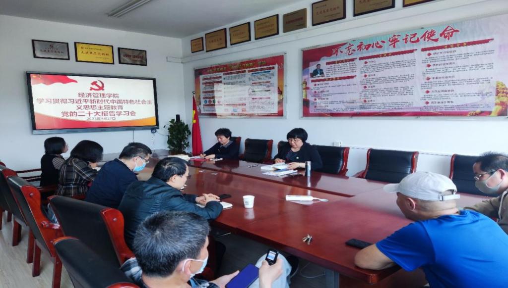 4月27日下午,经济管理学院在党建活动室召开全体党员学习会议,开展学习贯彻习近平新时代中国特色社会主义思想主题教育,会议由党总支副书记、院长李百秀主持。
