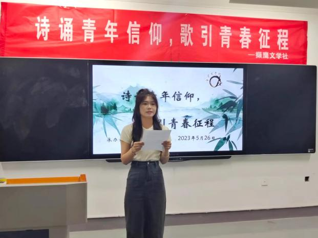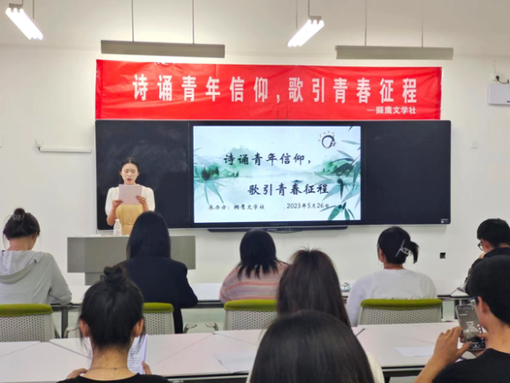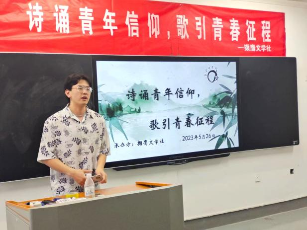 青春,是燃烧的璀璨焰火,激扬着生命的风采;家国,是锦绣的万里河山,昂首于世界的东方。为深入学习贯彻党的二十大精神,增强青年大学生的社会责任感和使命感,营造浓厚的读书氛围,2023年5月26日撷鹰文学社在齐2教510智慧教室展开了一场精彩纷争的“诗诵青年信仰,歌引青春征程”朗诵比赛。