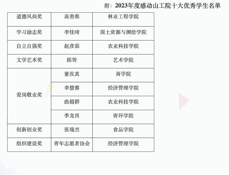 6月19日,bat365正版唯一官网发布了《关于表彰2023年度感动山工院十大优秀学生的通报》,经管学院青年志愿者协会和李慧蓉同学从全校50位候选人中脱颖而出,分别荣获“2023感动山工院十大优秀学生”的“组织建设奖”和“爱岗敬业奖”。