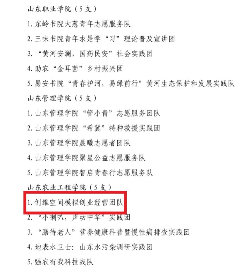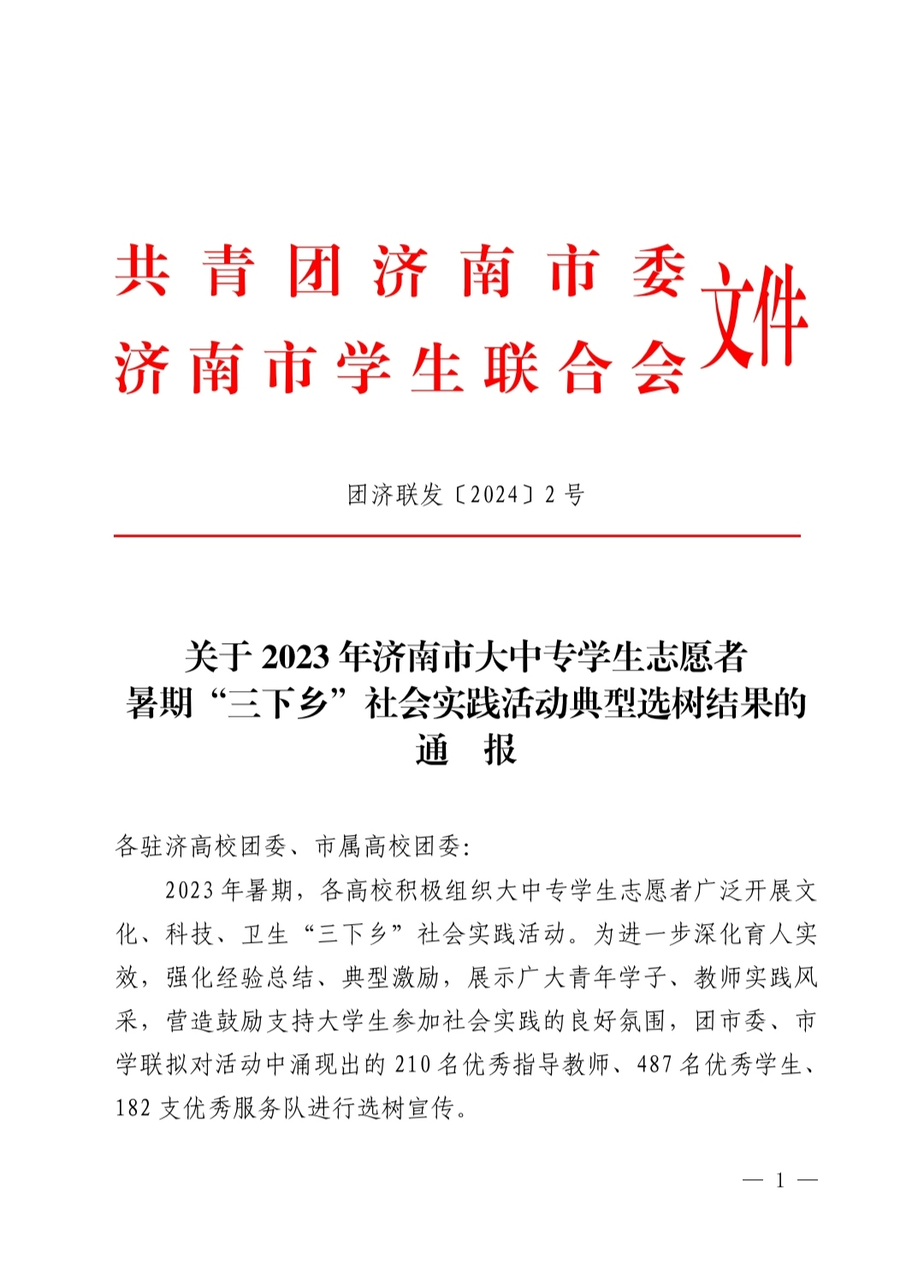近日,在共青团济南市市委和济南市学生联合会发布的《关于2023年济南市大中专学生志愿者暑期“三下乡”社会实践活动典型选树结果的通报》中,我院王硕珍老师荣获优秀指导教师、王英琳同学荣获优秀学生、创维空间模拟创业经营团队荣获优秀服务团队。
