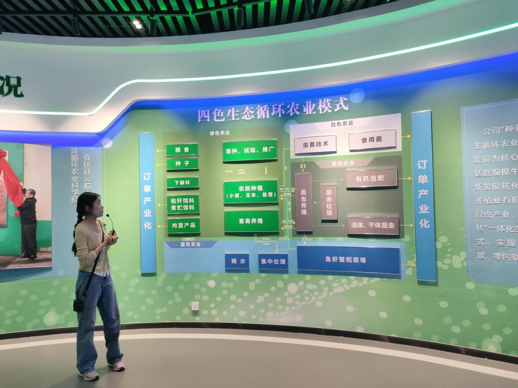 淄博禾丰种业科技股份有限公司是集育、繁、推于一体的农业高科技企业,是山东农业大学校外教学科研基地、山东省小麦区域试验点。活动伊始,参会人员在禾丰种业“院士工作站”观看了现代化农业高科技发展专题片,然后在讲解员的带领下参观了临淄现代农业科技展览馆,最后实地考察了“四色生态循环农业模式”,该模式是围绕一二三产业融合过程中产生的废弃物和低值过剩物,联合40多名专家、教授共同打造的“粮-虫-渔-菜-草-牧”融合的生态循环混合农业。