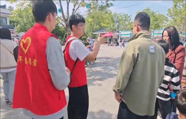 “青年志愿,一路同行”,志愿者在公交站点、景点入口处等人员密集场所提供咨询引导、景点介绍等志愿服务,让游客感受淄博志愿的人文关怀,展示淄博文明旅游的氛围。