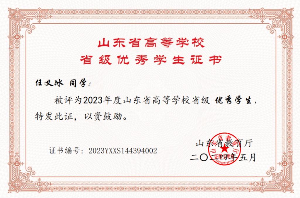 近日,2023年度山东省高等学校优秀学生干部、优秀学生评选落下帷幕,我院张紫嫣同学荣获“山东省高等学校优秀学生干部”称号,冯逸哲、任义冰两名同学荣获“山东省高等学校优秀学生”称号。