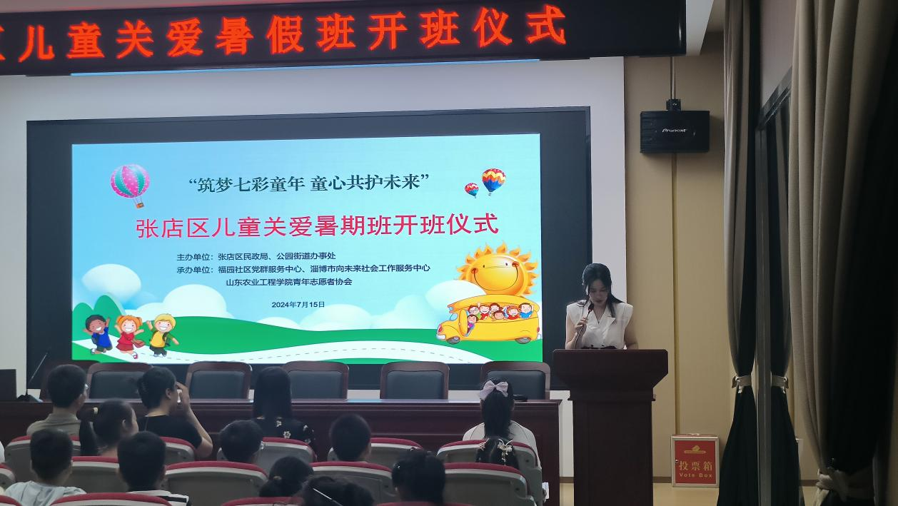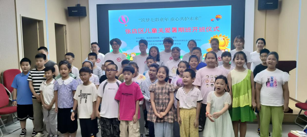 2024年7月15日,经济管理学院青春行中国梦暑假支教团在淄博市张店区福源社区党群服务中心举行“筑梦七彩童年 童心共护未来”张店区儿童关爱暑期班开班仪式。此次暑期社会实践旨在拓展学生视野、助力乡村教育事业发展蓬勃发展。