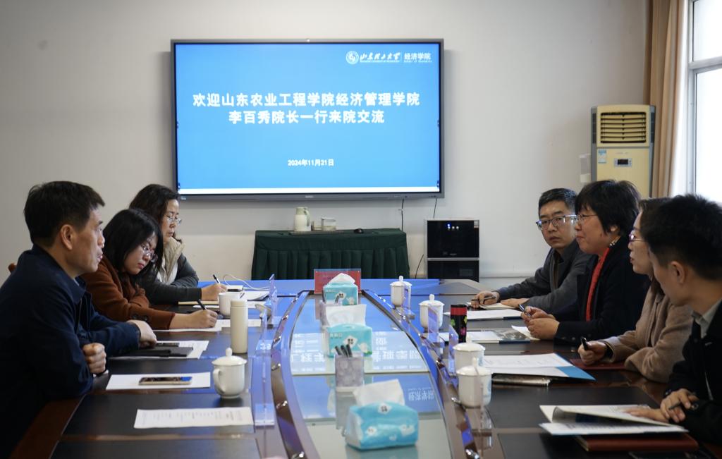 为增强交流与合作,推进融合发展,2024年11月21日上午,经济管理学院院长李百秀、副院长曲文俏、数字经济教研室主任赵毅及办公室副主任靖荣文一行前往山东理工大学经济学院,就硕士联合培养、社科基金培育及绩效考核改革等议题进行了交流座谈。山东理工大学经济学院党委书记范小平、院长张志新、副院长吴石磊、国际经济与贸易系主任邹松岐及办公室主任范秀红等陪同活动。