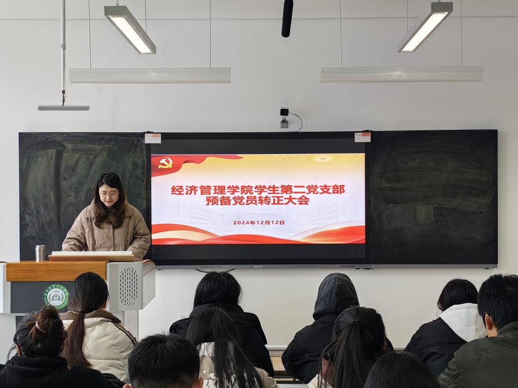 为进一步加强党员队伍建设,增强党员队伍的生机和活力,落实党支部发展党员工作,为党的事业增添新的活力和动力。2024年12月12日,经济管理学院学生第二党支部在文法西楼A312召开预备党员转正大会,会议主要讨论了关于任悦,张一鸣等十一名名预备党员同志转正的相关事宜。本次预备党员转正大会由我院学生第二党支部副书记张娟主持,全体学生党员参加此次大会。