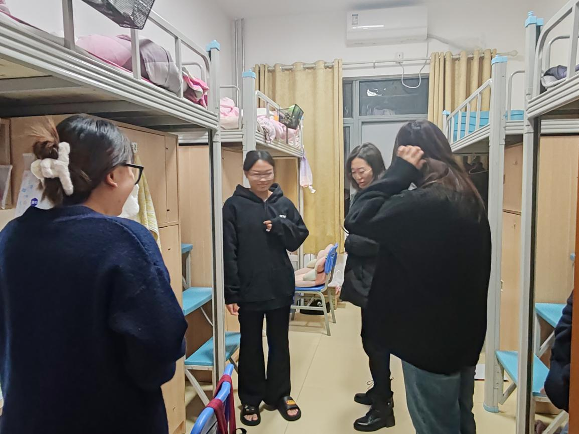 在走访过程中,曲文俏院长与同学们亲切交谈,不仅关心同学们的学习情况,了解大家的学习进度,还深入了解生活日常,细心询问学生是否遇到生活上的困难。面对老师的亲切关怀,学生们畅所欲言,分享宿舍生活趣事。同时,李娜老师积极鼓励同学们营造良好的宿舍文化氛围,还针对冬季用电安全、防火等问题做出重要提醒,确保宿舍生活安全无虞。对于同学们提出的各种问题,老师们耐心倾听并给予解答,让同学们切身感受到学院的温暖。