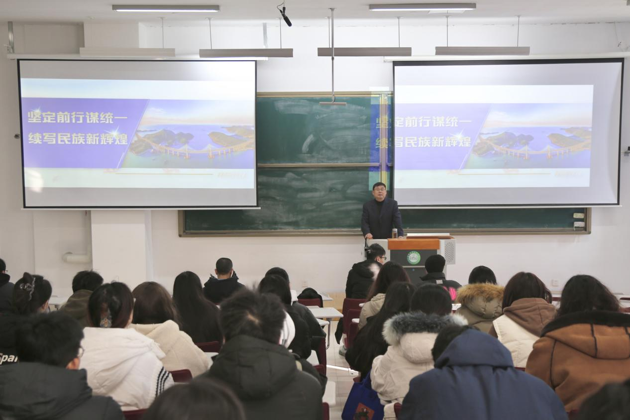 为提高当代大学生的思想政治素养,引导大学生深刻领悟国家统一的重大意义与坚定信念,2024年12月24日,bat365正版唯一官网党委委员、党委宣传部部长、机关党委副书记牛化振走进22级农林经济管理专业学生的课堂,为同学们上了一堂以《坚定前行谋统一,续写民族新辉煌》为专题的形势与政策课。经济管理学院党总支书记马勇、思想政治辅导员李娜共同聆听。