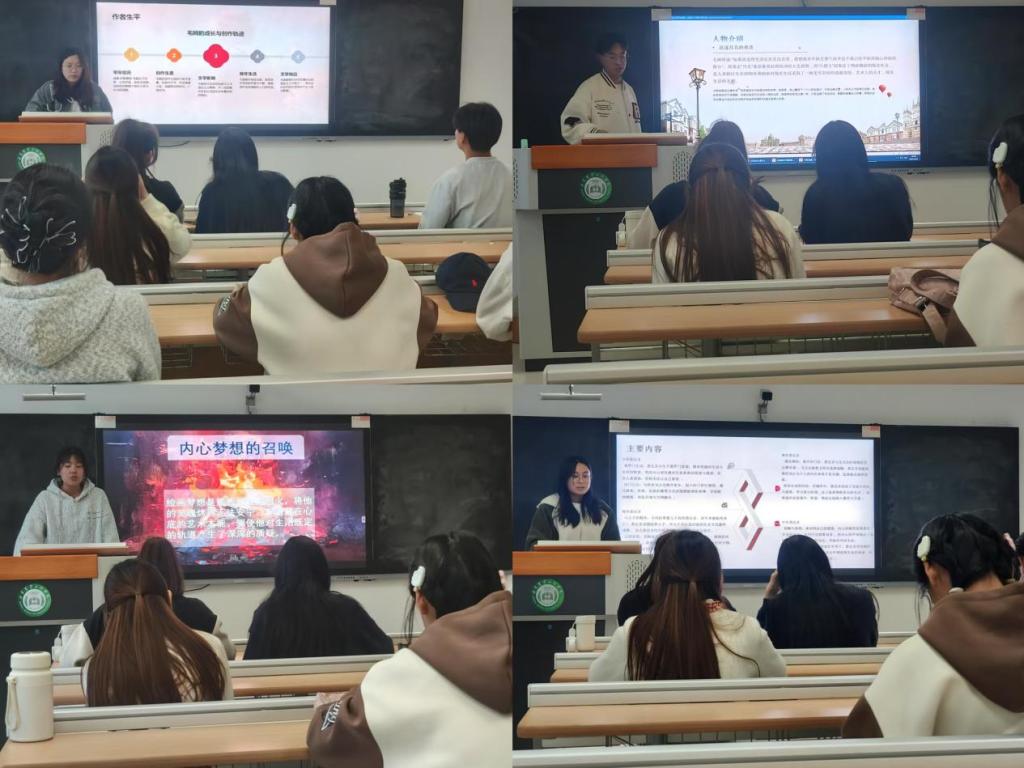 分享会上,同学们借助PPT、视频、音频等多种方式分享了自己对经典作品的所思所感,无论是《月亮与六便士》中画家追寻理想的故事,还是《先知》中对爱、婚姻、子女等人生主题的剖析,都探讨了现实与理想的平衡之道,引发了在场同学们的共鸣和思考。