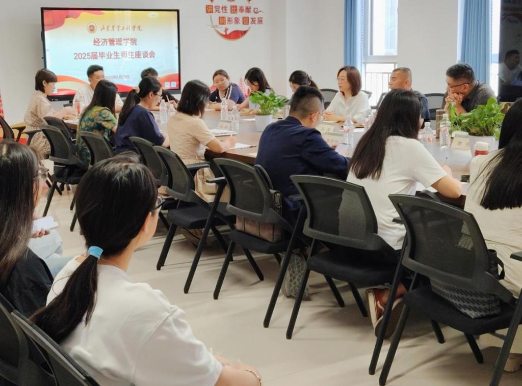 搭建师生沟通桥梁,倾听毕业生心声,2025年6月23日,经济管理学院在文法西楼A309举办毕业生师生座谈会。经济管理学院党总支书记马勇、党总支副书记杜锋、副院长曲文俏、各教研室主任,辅导员代表及各班级毕业生代表齐聚一堂,共忆校园岁月,交流发展建议。